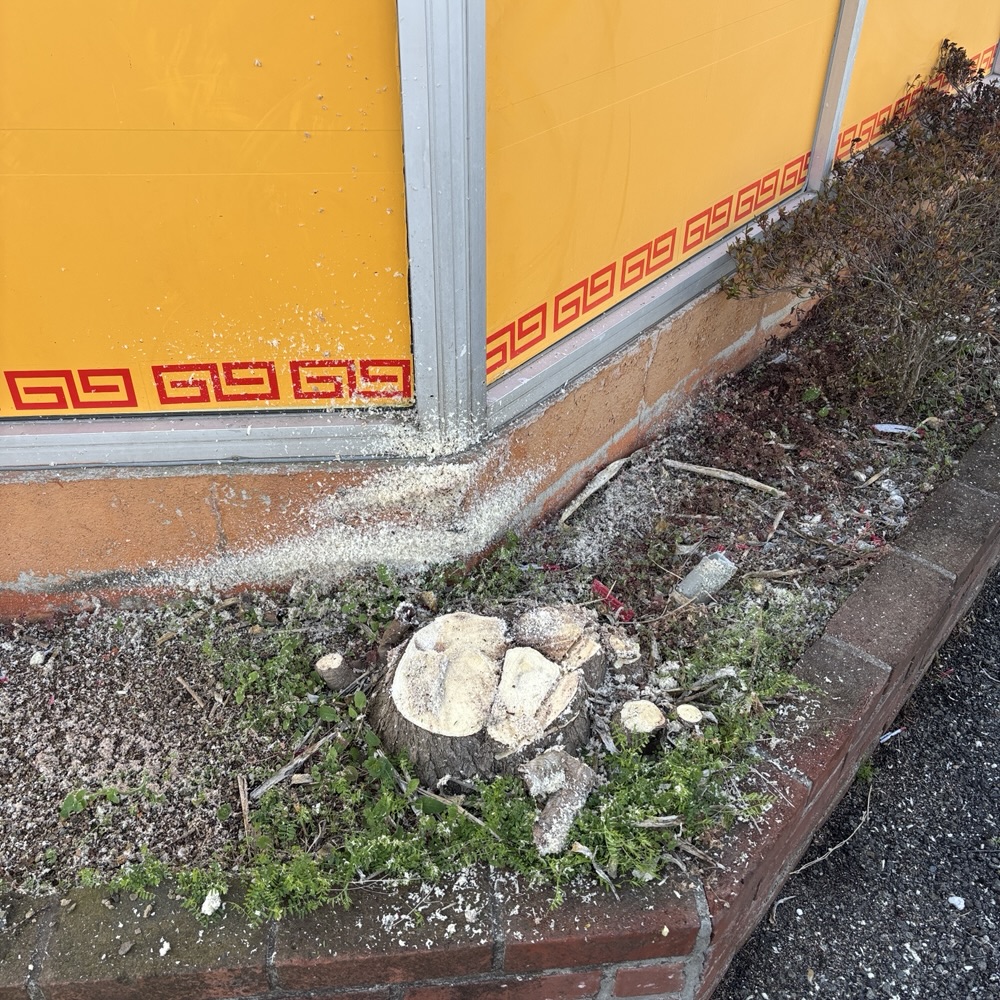 ラーメン屋の跡がある店舗ですが、ちょっとこの木が大きくなりすぎてレンガを押し出してきたので建物基礎を痛める前に伐採します。